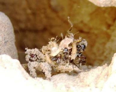 Somebody please tell me what these odd little guys are. Roughly the the size of a large spitball, I found about ten of them in the Afghan desert inhabiting a small hole that you'd expect a tiny mouse to live in. They only appeared in the evening, after the intense daytime heat dissipated. Obviously insect like - note the legs grasping the side of their home - but beyond that I have no idea what to call them. The legs are covered with sand particles but the rest of the body is heavily decorated with insect body parts, mainly ants from what I can see, a molt or an exoskeleton from some other creature is obvious in the photos, too. This leads me to believe they are some kind of ant predator, but I have never seen anything like them before. Their habitat was unfortunately destroyed by a construction project over here shortly after I took these photos. Despite an extensive search I've not been able to find any more examples. If anyone knows what these fascinating creatures are please contact me.