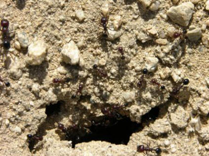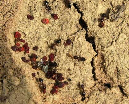 One of the wild kingdom's all time champions of adaptability is the ant. The one on the left is a large type, well over a quarter of an inch long. Descending the scale in size, but topping all other species in numbers are these red black ants in the middle. Tinier still are the little black fellows on the right.